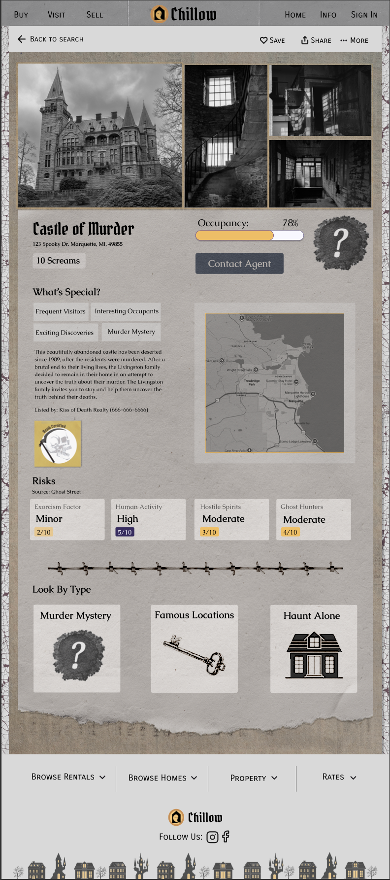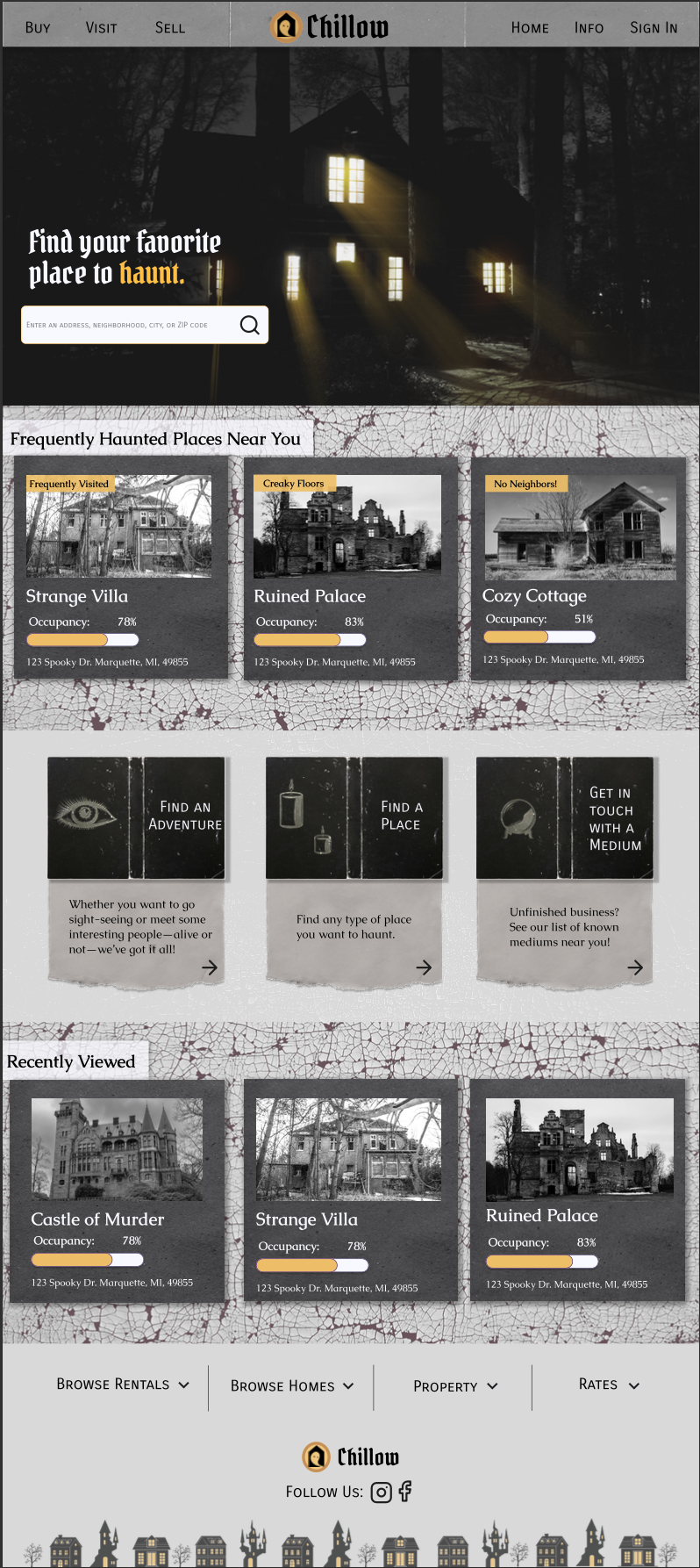 The concept for this project was to redesign a popular website for a niche audience. I redesigned Zillow for ghosts looking for places to haunt. I utilized Figma for prototyping and Adobe Illustrator for assets.